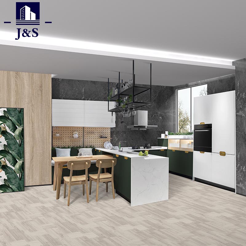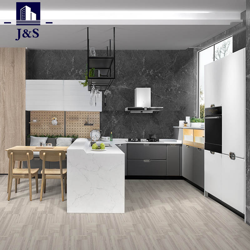J&S சப்ளை புதிய வடிவமைப்பு மேட் வெள்ளை சமையலறை அலமாரி, இது அக்ரிலிக் முடிக்கப்பட்ட கதவு சமையலறை அமைச்சரவை. அக்ரிலிக் கதவு பேனல்கள் நல்ல வெளிப்படைத்தன்மைக்கு பயன்படுத்தப்படுகின்றன, ஏனெனில் இந்த வகையான கதவு பேனல்கள் நிறமற்ற மற்றும் வெளிப்படையான பிளெக்ஸிகிளாஸ் தகடுகளால் செய்யப்படுகின்றன, மேலும் அதன் ஒளி பரிமாற்றம் 92 ஐ விட அதிகமாக இருக்கும். %, ஒரு கண்ணாடி விளைவை அடைதல் மற்றும் சமையலறை இடத்தை பார்வைக்கு விரிவுபடுத்துதல்.