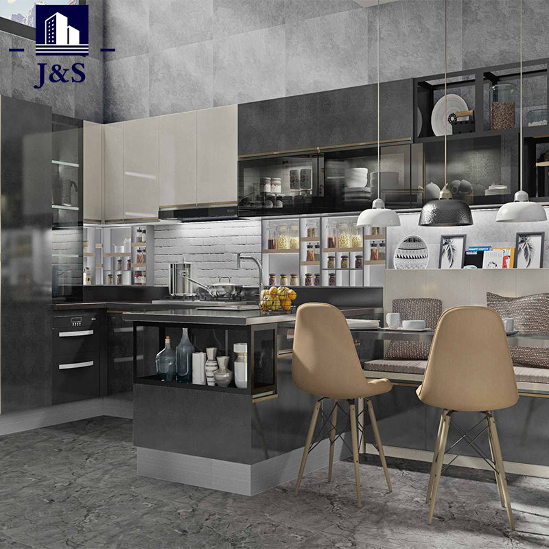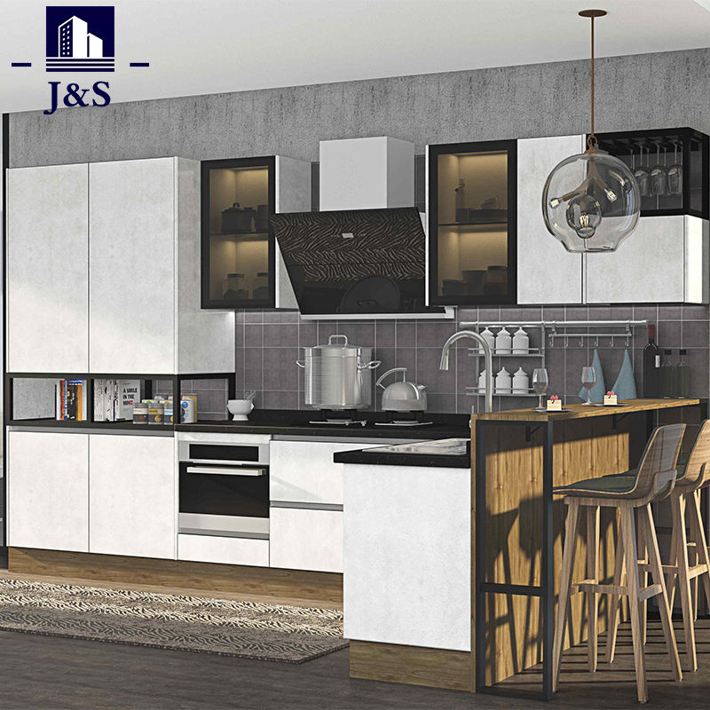 J&S விநியோக ஊக்குவிப்பு ஆடம்பர நாட்டு சமையலறை வடிவமைப்புகள் சிறந்த விலை .PET கான்கிரீட் வண்ண சமையலறை கதவு, துருப்பிடிக்காத எஃகு நீடித்த பெஞ்ச் மேல்.